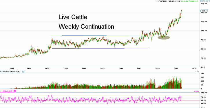 Today we are taking an historic look at the Live Cattle futures market going back nearly 50 years for a perspective on the current price move. Prices have increased over 6 fold since the mid-sixties when prices were below $25 per hundredweight.? Prices were relatively subdued from the late 1970?s until 2003 when prices nearly broke the 100.000 price level. Since that time, was have seen increased price volatility that ultimately resulted in the nearly 5-year bull market run following the major low near 75.000 back in the summer of 2009 during the height of the global financial crisis.