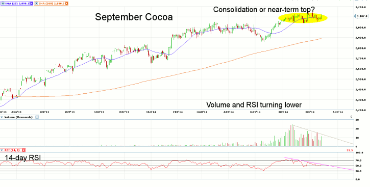 Cocoa has been the only so called ?softs? commodity that is in a bullish trend of late, but there are now some signs that commodity bears may be starting to indulge in their chocolate cravings. A report on European Cocoa grindings was viewed as ?disappointing? by analysts as grindings fell by 0.7% in the second quarter. This may be a sign that demand for Cocoa products, especially Cocoa Butter, might be starting to wane. The market is already well supplied with Cocoa Power, so any slippage in demand for Cocoa Butter could further curtail European grinding in the third quarter. On the supply side, Nigeria is expected to see a nearly 10% rise in Cocoa production for the 2014-15 season as a government program to increase Cocoa production by subsiding the cost of fertilizer and insecticides for producers. Traders continue to keep their focus on production out of the Ivory Coast, the world?s largest Cocoa producing nation. Recent rains might be slowing Cocoa arrivals for the mid-crop, but adequate moisture levels should aid production for next season main crop, with some analysts looking for a potential record crop in 2014-15. If true, we would need to see Cocoa demand continue at its current strong pace, especially out of Asia, going into 2015 in order to support prices at current rather lofty levels.?????? ?