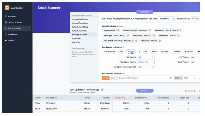 Welcome to the ORATS earnings report where we scan for companies with upcoming earnings announcements, check out historical earnings information, and find a potential options trade.?Read on or watch the video overview here: https://youtu.be/KbFcI0uTmgM.?Let’s start by running a scan on stocks reporting earnings this week, which includes the total option volume indicator, sorted from greatest to least.