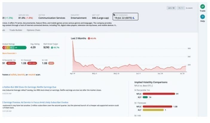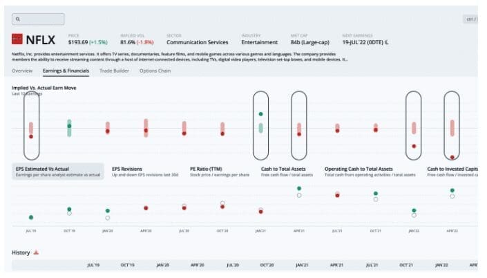 Focusing on Netflix, as we click through, we see this large-cap company in the entertainment industry reports earnings on Tuesday, July 19th, after the close.