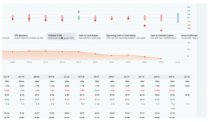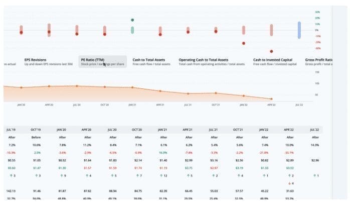 During that time, the post-earnings move was outside of the implied range 5 times. In those cases, long straddles were profitable. The rest of the earnings moves likely yielded profitable short straddles. We can overlay quarterly financial data by clicking on the ratios below the earn move graph. Let’s look at the PE ratio, which is the stock price divided by the trailing twelve months earnings per share.
