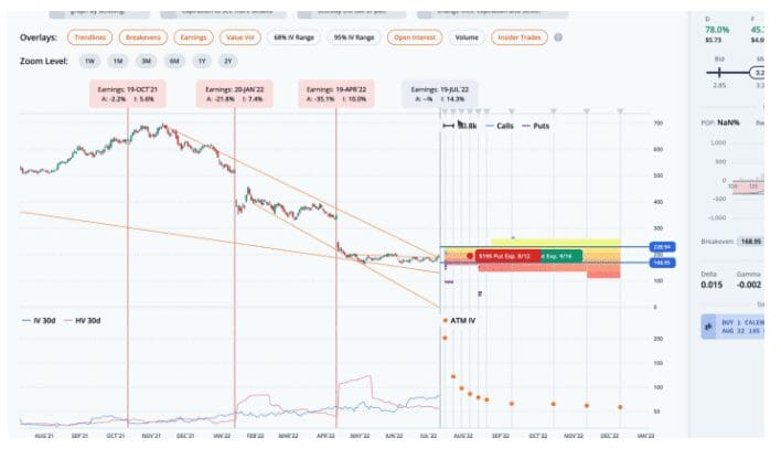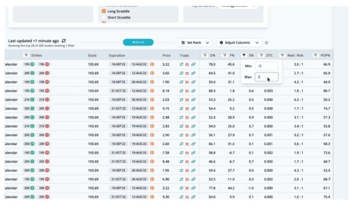 This helps narrow the results to trades that are fairly priced. The highest ranked trade is a Long Put Calendar with strikes at 195, expiring on Friday, September 16th and Friday, August 12th, for a debit of $3.22.