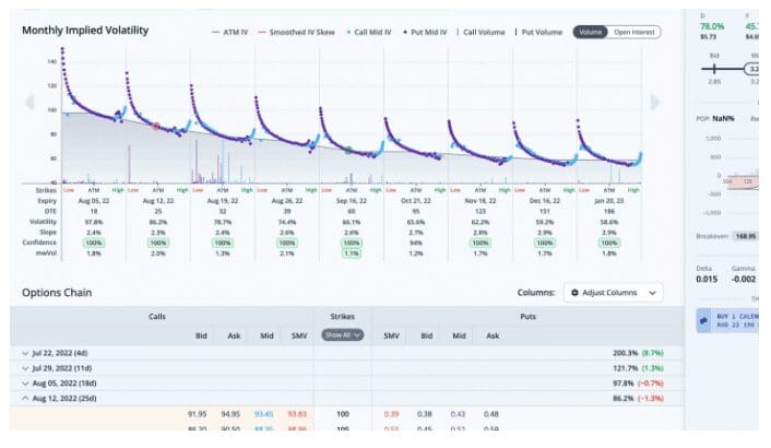 We can also see this trade overlaid on the monthly implied volatility graph in the chain tab. The legs for this trade are circled. For any questions or issues with the article, please contact otto@orats.com. To subscribe to the dashboard, please visit https://orats.com/dashboard.