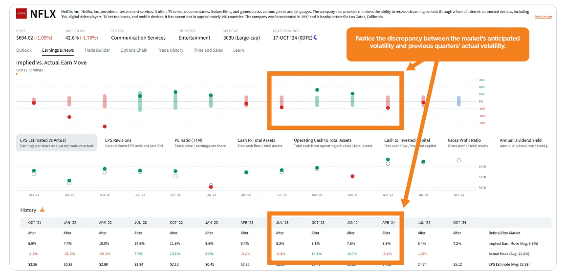 These examples illustrate that Netflix has a history of unpredictability around earnings, particularly following quarters with lower-than-expected moves. While the implied move for today suggests a more minor reaction, historical data indicates that Netflix may surprise the market with a more significant swing.