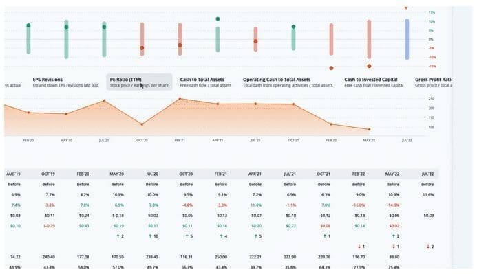 During that time, the post-earnings move was outside of the implied range 5 times. In those cases, long straddles were profitable. The rest of the earnings moves likely yielded profitable short straddles. We can overlay quarterly financial data by clicking on the ratios below the earn move graph. Let’s look at the PE ratio, which is the stock price divided by the trailing twelve months earnings per share.