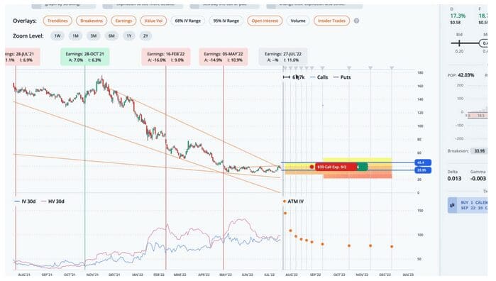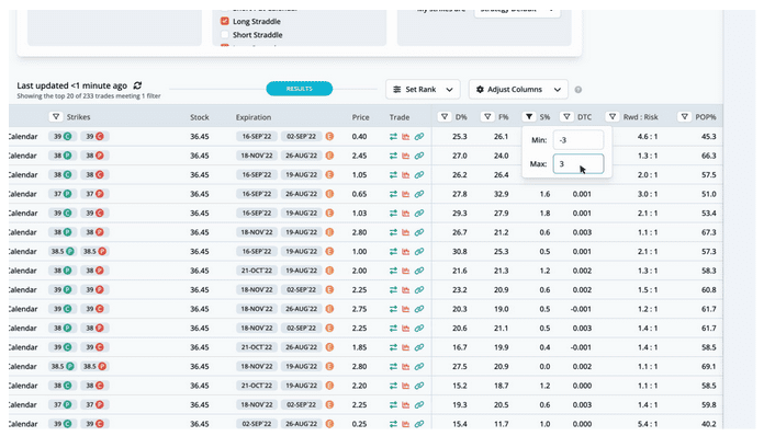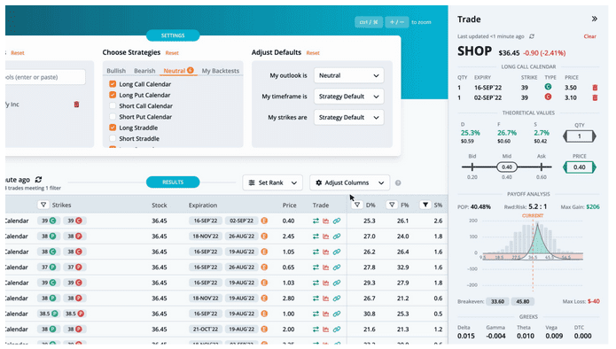 This helps narrow the results to trades that are fairly priced. The highest ranked trade is a Long Call Calendar with strikes at 39, expiring on Friday, September 16th and Friday, September 2nd, for a debit of $0.4.