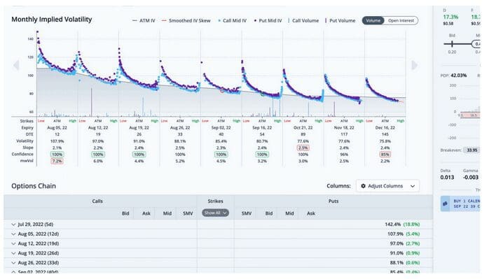 We can also see this trade overlaid on the monthly implied volatility graph in the chain tab. The legs for this trade are circled. For any questions or issues with the article, please contact otto@orats.com. To subscribe to the dashboard, please visit https://orats.com/dashboard