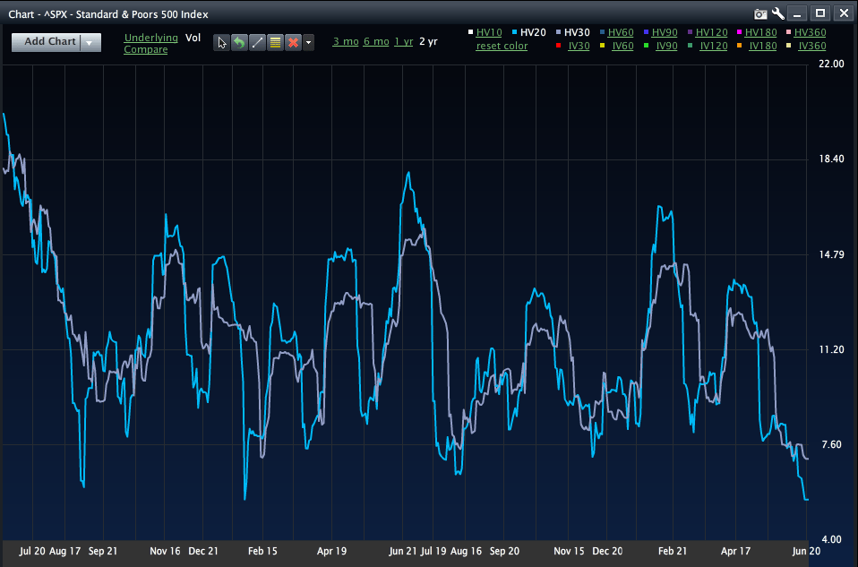 If one were to look back at the last 20 days of trading and compare it to the previous 10 years, one would be looking at just about the least movement over that 20 day period over the last 10 years. ?In fact it would be one of the slowest periods ever. ?Once yesterday is included in the number, ?expect realized volatility which in TD has measured around at 3.4% and in Livevol at around 5.4% to drop to about 3.25% and near 5%, respectively. ?Regardless of the HV measurement, ?both would have to be considered just about the lowest measured level in the last 10 years. ?The only period that comes close was around January of 2010. ?Take a look at how things have fallen off:
