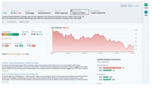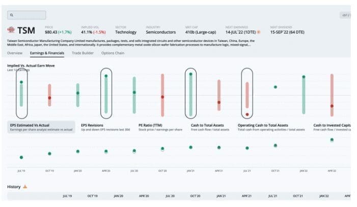 The earnings and financials tab takes us to more detail showing the options market expecting a move of 4.5% in either direction. This move was breached in 4 out of the last 12 earnings.