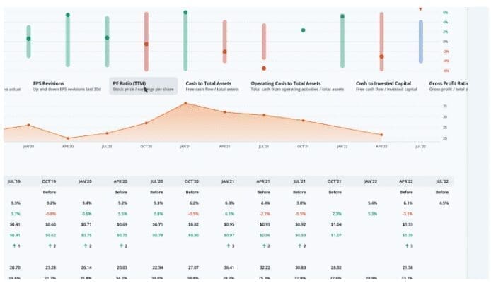 During that time, the post-earnings move was outside of the implied range 4 times. In those cases, long straddles were profitable. The rest of the earnings moves likely yielded profitable short straddles. We can overlay quarterly financial data by clicking on the ratios below the earn move graph. Let’s look at the PE ratio, which is the stock price divided by the trailing twelve months earnings per share.
