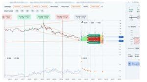 Next, let’s look at this trade in the trade builder. Over the last month, the stock price fell 7.4%, while the thirty-day implied volatility rose 4.0%. The average slope of the trendlines is negative. The heatmap on the right side of the graph is green where volatility and slope are undervalued, and red where they are overvalued. In this case, short term IV and slope are undervalued, while the long term is overvalued.