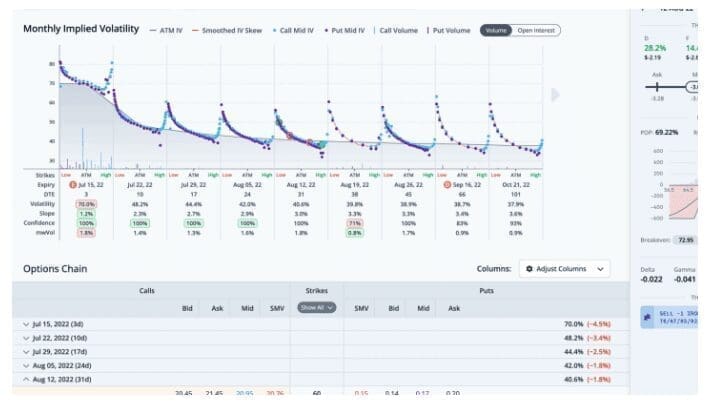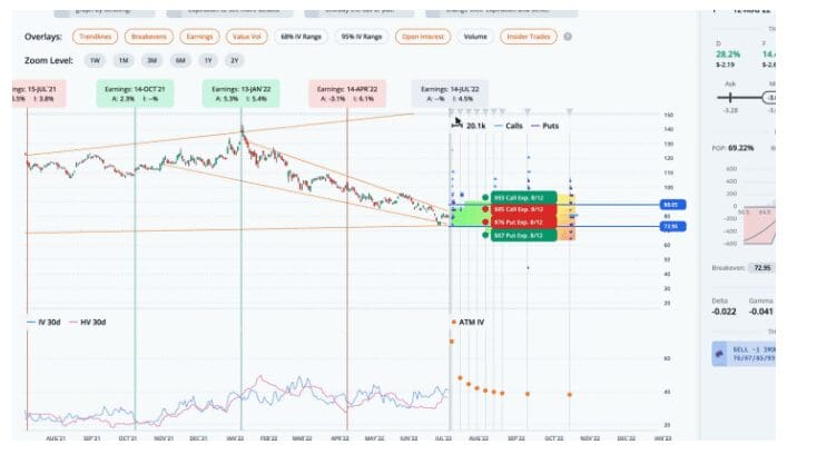 This helps narrow the results to trades that are fairly priced. The highest ranked trade is a Iron Condor with strikes at 67, 76, 85, and 93, expiring on 2022-08-12, for a credit of $3.07.