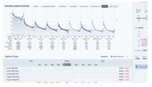 We can also see this trade overlaid on the monthly implied volatility graph in the chain tab. The legs for this trade are circled. For any questions or issues with the article, please contact otto@orats.com. To subscribe to the dashboard, please visit https://orats.com/dashboard.