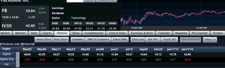 Selling a broken wing butterfly on the upside in the May ordinary cycle in FB looks like a decent trade. Make sure the short strike is over 1 standard deviation from the ATM.