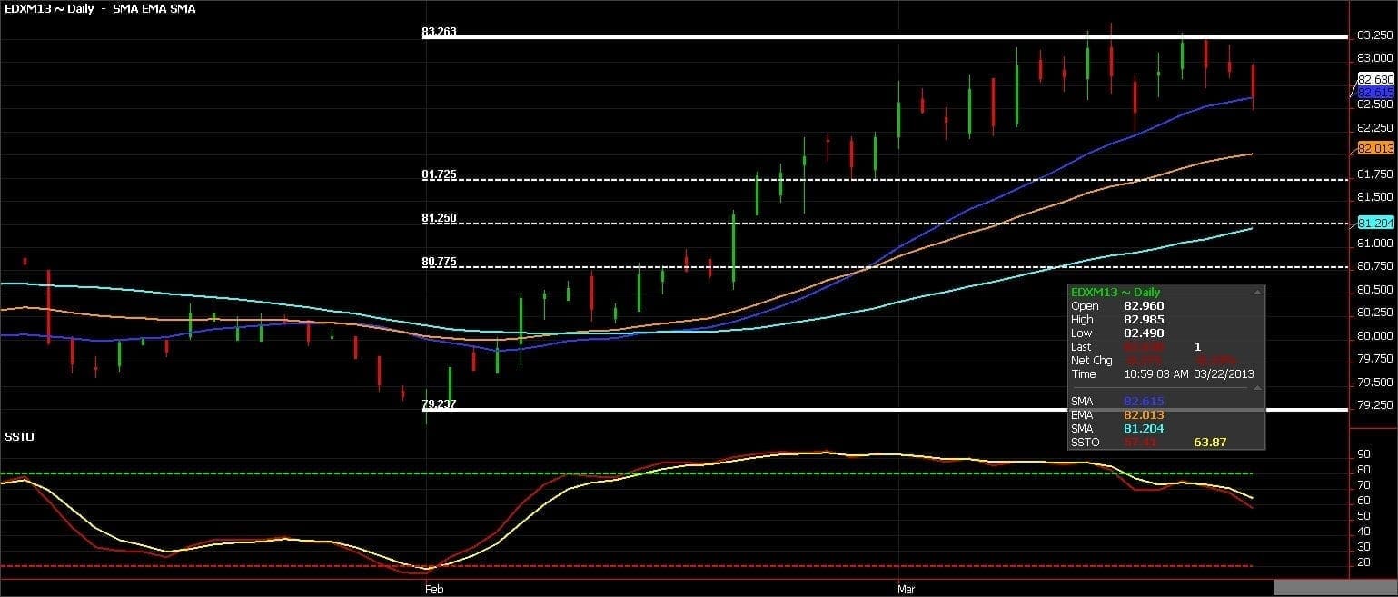 If the 20-day MA gives way the next significant support comes in just under the 34-day EMA (orange line) at the 38.2% Fibonacci level. That should be your first target in bearish trades. I suggest positioning yourself to capitalize on a trade back to roughly 81.25 in June futures. This level shows confluence between the 50% Fib and the 50-day MA (light blue line).
