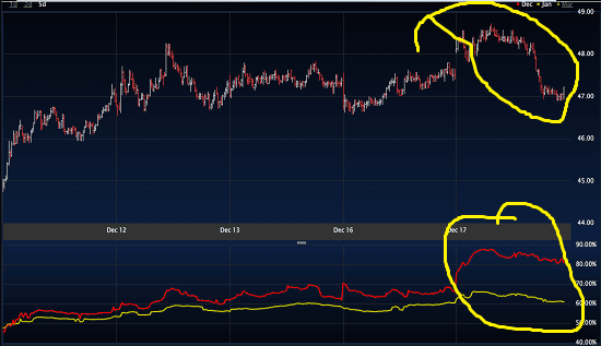 You cannot hide from demand and one of the most active volatility ETP?s, the VXX, is showing big swings in price and volatility.? Note that VXX sold off from yesterday’s highs before any news was announced.? What did not sell off was the implied volatility of the options.? With no news out the VXX juice remains bid.