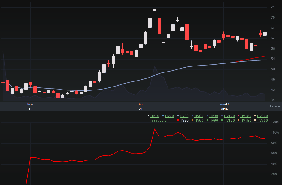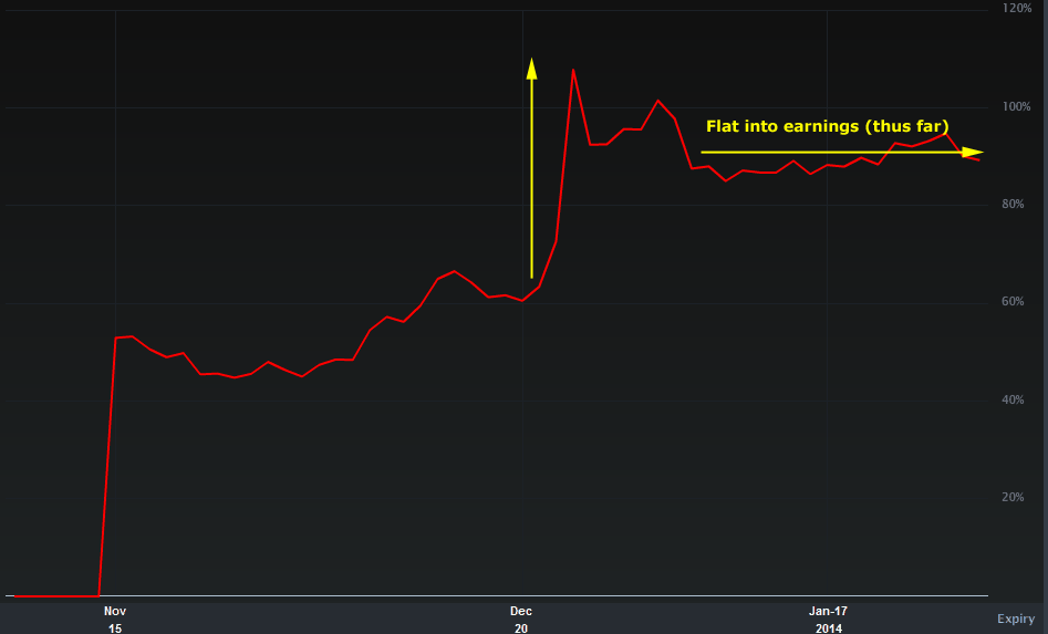 But let’s focus on earnings volatility and the earnings event, which is due on 2-5-2014 AMC (aka Wednesday).
