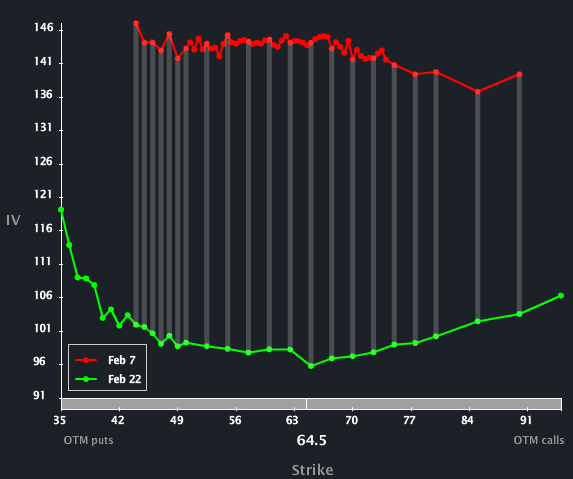 So, basically, that means the time between Feb 7 and Feb 21 (Feb monthly expiration) is worth ~$1.60 on $65 strike straddle.? This implies (sort of) that whatever the move is off of earnings, the stick movement after Feb 7 but before Feb 21 is going to be pretty muted.