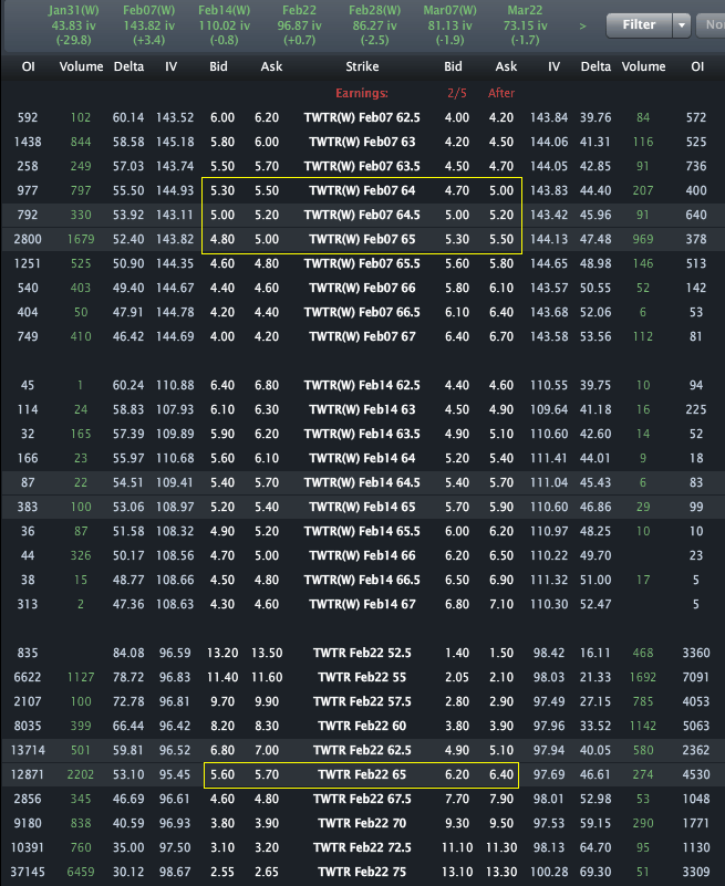 The Feb 7 weekly $65 strike straddle is priced to ~$10.30.? The Feb monthly $65 strike straddle is priced to ~$11.90.