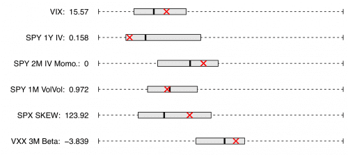 Box plots in the chart above mark, in order, the minimum, first quartile, median, third quartile, and maximum two year values for each risk indicator, with the current value shown as a red cross. Indicators are, in descending order, the CBOE Volatility Index (VIX); SPY one year at the money implied volatility; S&P 500 two month IV momentum, measured as the difference between exponentially-weighted 15- and 30-day moving averages of ATM IV; S&P 500 one month volatility of volatility, measured as the two-week standard deviation of daily log changes in 1M IV; SPX SKEW index, provided by the CBOE; and VXX three month rolling beta with SPX as the benchmark.