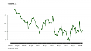 Rolling three month VXX beta shows that daily changes in the ETP are smaller than we might expect compared to the last couple years of data; however, at -3.8, short term VXX beta is still below the long term average, meaning that traders are buying volatility on the equity dips and selling premium on the rips about as aggressively as we?re used to seeing. If this number were closer to -3, we would take it as a sign of complacency.