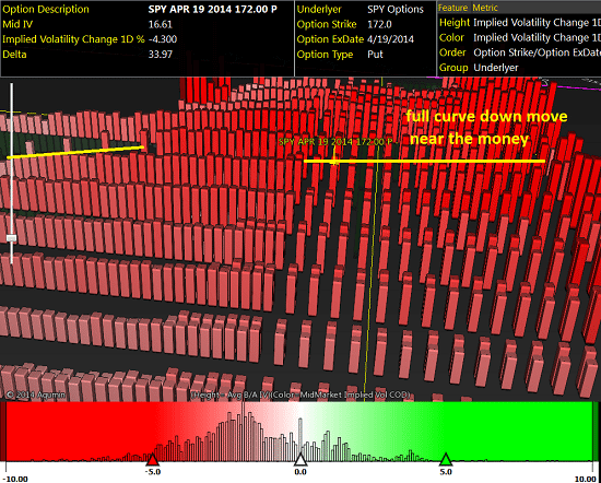 The inverted scale OptionVision landscape has IV down all across the curve in the SPY.? This is what I call a fast shift down.? Save for the very OTM puts on left, the IV got torched Thursday as traders started looking past the NFP number from Friday.