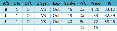 The call spread has a reasonable risk reward ratio since the .57 debit is 28.5% of the distance between the two strikes. Use a close back below the last pivot at 40 as the SU (stop/unwind).