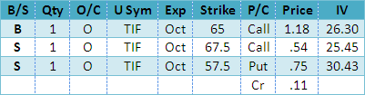 Since the next earnings report date comes after the October options expire, we will use the December options with 102 days to expiration. This will minimize our time decay loss and maximize vega while the implied volatility increases. As for a stop, we will close the position if the implied volatility index mean is less than 70 in 30 day’s time.