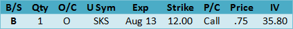 The suggestion is to buy SKS Aug 2013 12 Calls for .75. The current implied volatility is 35.80.