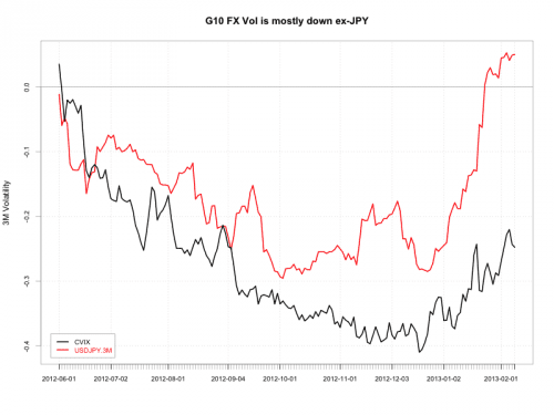 The decline in currency volatility, shown here with Deutsche Bank’s CVIX index (G10 3M FX implied volatility, in black), was relentless throughout 2012. And even though the index has rallied somewhat in 2013, once you factor in the huge increase in yen volatility (red), overall G10 vol still looks moribund. USDJPY accounts for more than 20% of the CVIX index.