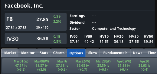 If you look in the OptionVision Landscape there is not a lot of variation in the implied volatility in the first 5 Weekly expiration cycles.? There is almost no contango at all.? Contango is just the effect of lower implied volatilities in the front month than in the back month.? Normally when a stock is not doing much the IV exhibits this pattern.? With the nice pop on the close the term structure in FB is a bit different.? It is dead flat until you get to the earnings cycle a bit farther out.? I find this in a popular name like FB to be a bit strange.? This allows a trader to buy time spreads for pretty good prices since they don?t have to sell the front month options down. ?The fact that there is not much contango there means an investor can use the front options to help pay for the back month options at favorable prices.