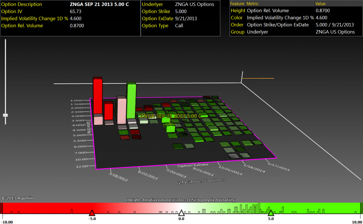 Realized volatility in ZNGA over the last 60 days is 64%.? Even in the last couple of weeks ZNGA has managed some decent ranges.? The last couple of days have been 8% moves intraday.? Today the name broke $3.6 for the first time in a while. The interesting story is not that some hedge funds are buying, which is good, but that the IV is still in the mid 50% range for a good distance out.? If you look at the OptionVision 3D chart below there is some buying in the OTM calls in Sep.? Crazy right? A stock goes up and the longer term IV goes up.? If you own some ZNGA, that is a good sign.