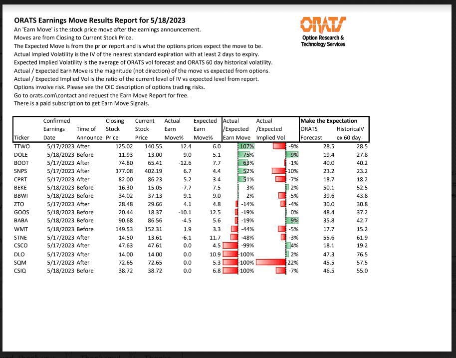 Information available on ORATS.com is available to all subscribers. ORATS does not make recommendations as to particular securities or derivative instruments, and does not advocate the purchase or sale of any security or investment by you or any other individual. ORATS does not guarantee the accuracy, completeness or timeliness of the Information. By using the Services of ORATS.com, including any applications or content available through us, you agree that use of the Services is entirely at your own risk. You understand and acknowledge that there is a very high degree of risk involved in trading options and securities. Past results are not indicative of future returns that may be realized by you. We assume no responsibility or liability for your trading and investment results.