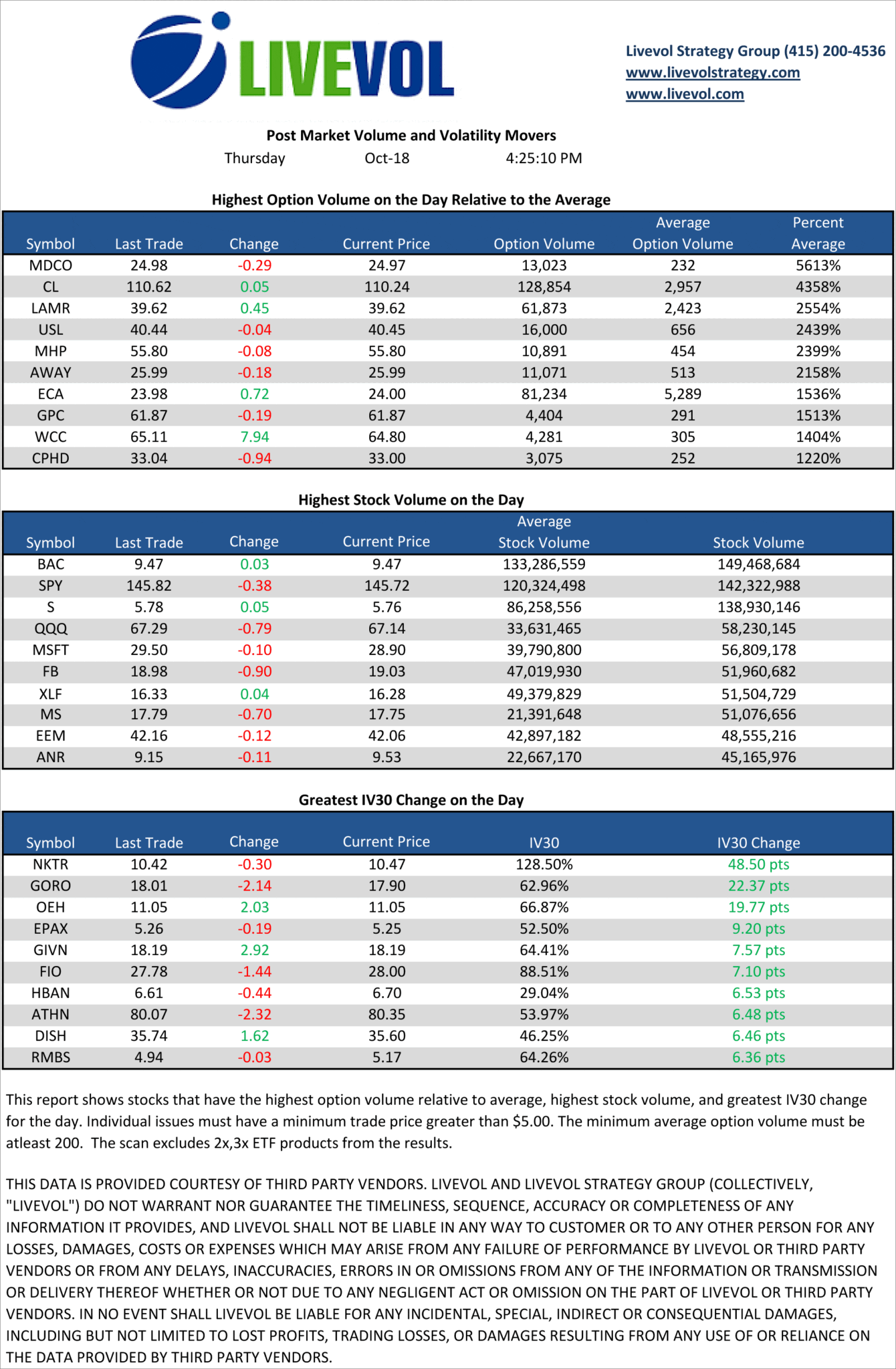10/18/12 Post-Market by Ophir Gottlieb | Oct 19, 2012 | Industry, Unusual Activity Post-market volume and volatility movers for Thursday, October 18