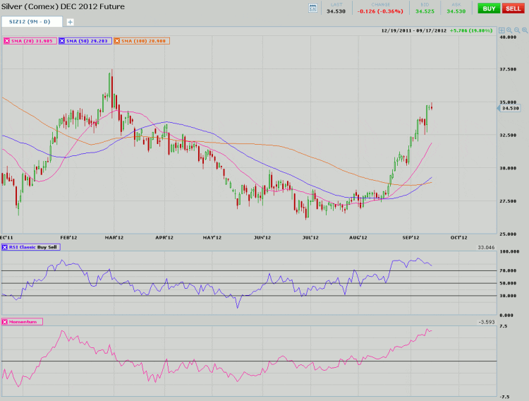 Turning to the chart, we see the December Silver contract rising well over $6 in the span of a month. Prices have moved through resistance at 32.50 and 34.15 without as much as a hiccup. The next upside target may be the spike high near 37.50.