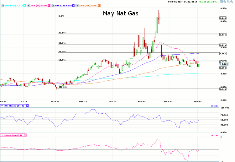 Turning to the chart, we see the May Natural Gas contract testing the 4.25 support level.? Failure to hold here could result in the price of Natural Gas falling back to the mid-3.00?s.? May Natural Gas prices have retraced beyond the 61.8% Fibonacci retracement level.? Prices are trading below the 100-day moving average.? Several more closes below the average could be seen as bearish.??