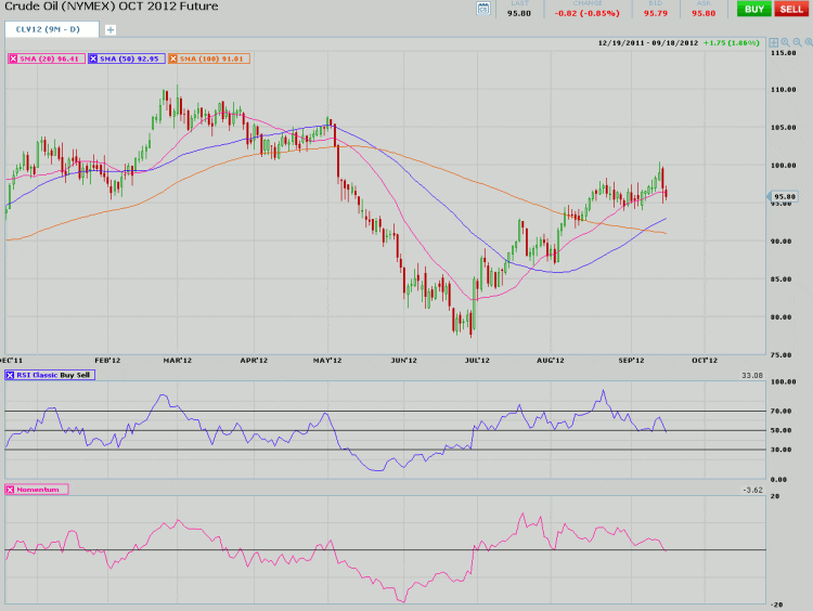 Crude Oil dropped sharply yesterday, as there was simply not enough momentum to carry prices beyond the $100 level. Failure to break through this pivotal level created a profit-taking opportunity for longs. The Oil market has been steadily rising since late June without so much as a hiccup. The US Dollar falling due to the Fed firing-up the printing presses created ripe conditions for Oil bulls. There is some hope that all of the pumping from various Central Banks could aid the economy, but this was much more of a currency play. The energy markets have also benefited from the constant turmoil in the Middle East. With some of the heavy-handed leaders removed during the Arab Spring, extended protests may be the rule rather than the exception.