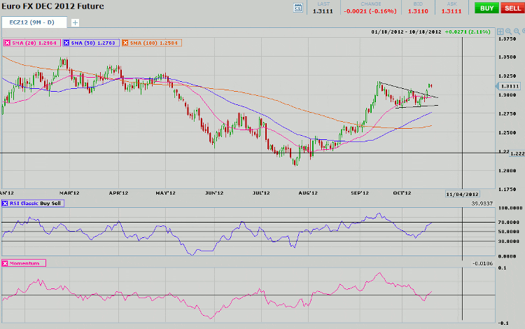 Turning to the chart, we see that the December Euro contract jumped and formed a gap between the October 16th and 17th trade dates. Prices failed to advance beyond the relative high close of 1.3143 thus far. Breaking through this relatively minor resistance level would suggest prices could approach the 1.3250 mark.