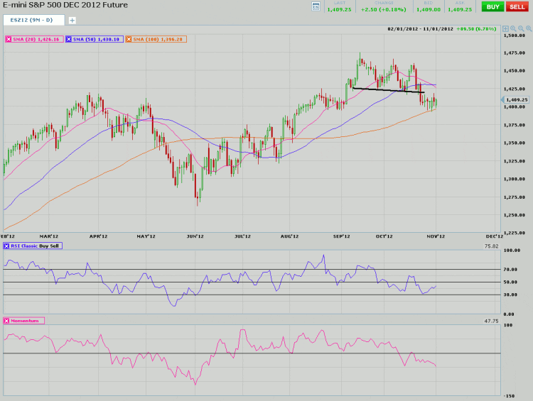 Index futures have been hanging around the 1400 level after falling from recent highs. The recent spate of bad earnings has planted seeds of doubt in the minds of many traders regarding the current state of the economy. Adding to this uncertainty was the major storm that hit the Northeast, which could account for billions of dollars of economic losses.Overnight news from China indicating manufacturing data there has picked up appears to have failed to inspire equity index traders in the US. Futures are lower ahead of today’s economic data.