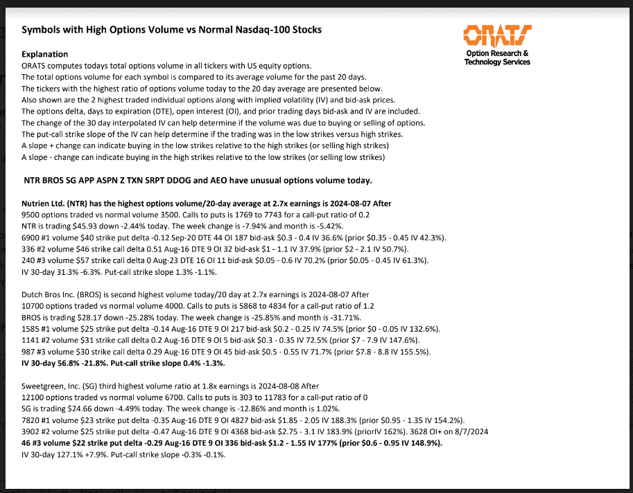 NTR, BROS, SG, APP, ASPN, Z, TXN, SRPT, DDOG, and AEO have unusual options volume today.