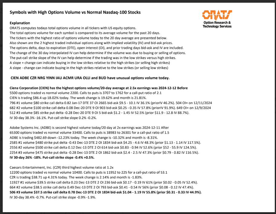 CIEN, ADBE, CZR, NRG, YINN, IAU, ACMR, URA, OLLI, and BUD have unusual options volume today.