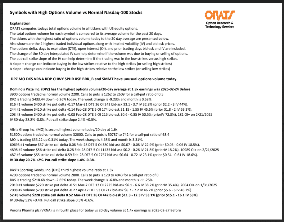 DPZ, MO, DKS, VRNA, KDP, CHWY, SPHR, XSP, BRK_B, and SMMT have unusual options volume today.