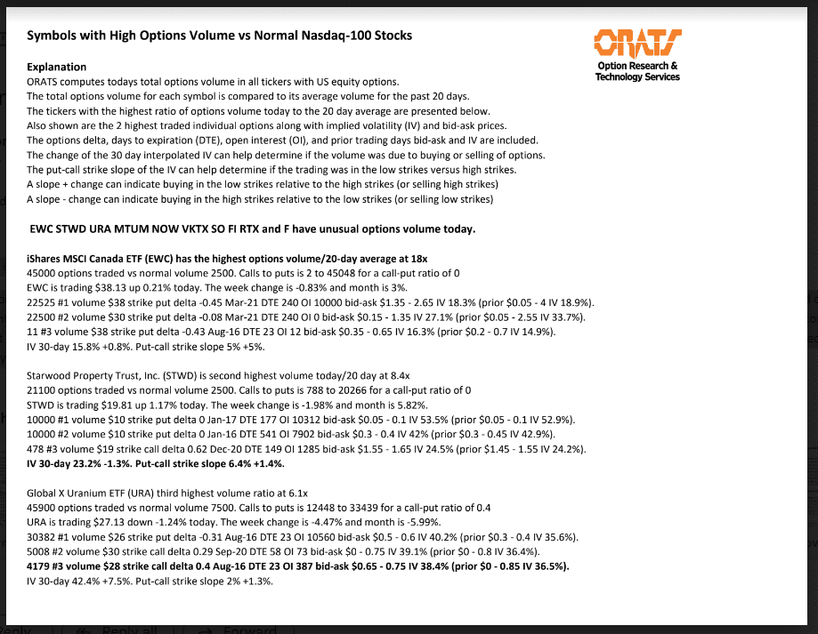 EWC, STWD, URA, MTUM, NOW, VKTX, SO, FI, RTX, and F have unusual options volume today.