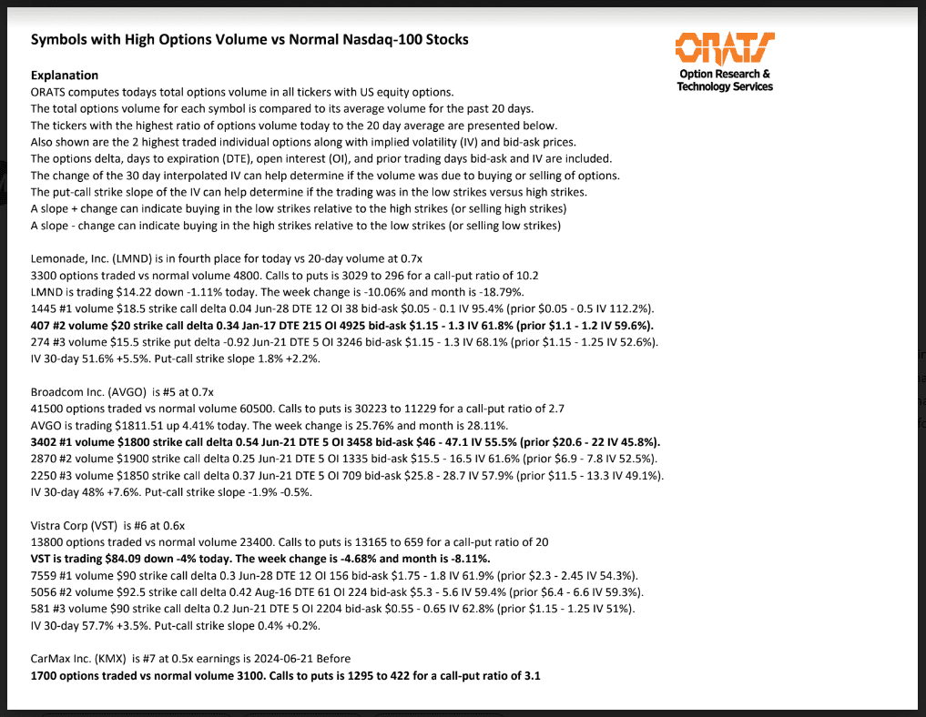 LNG, LEN, FUTU, LMND, AVGO, VST, KMX, MU, NRG, and W have unusual options volume today.