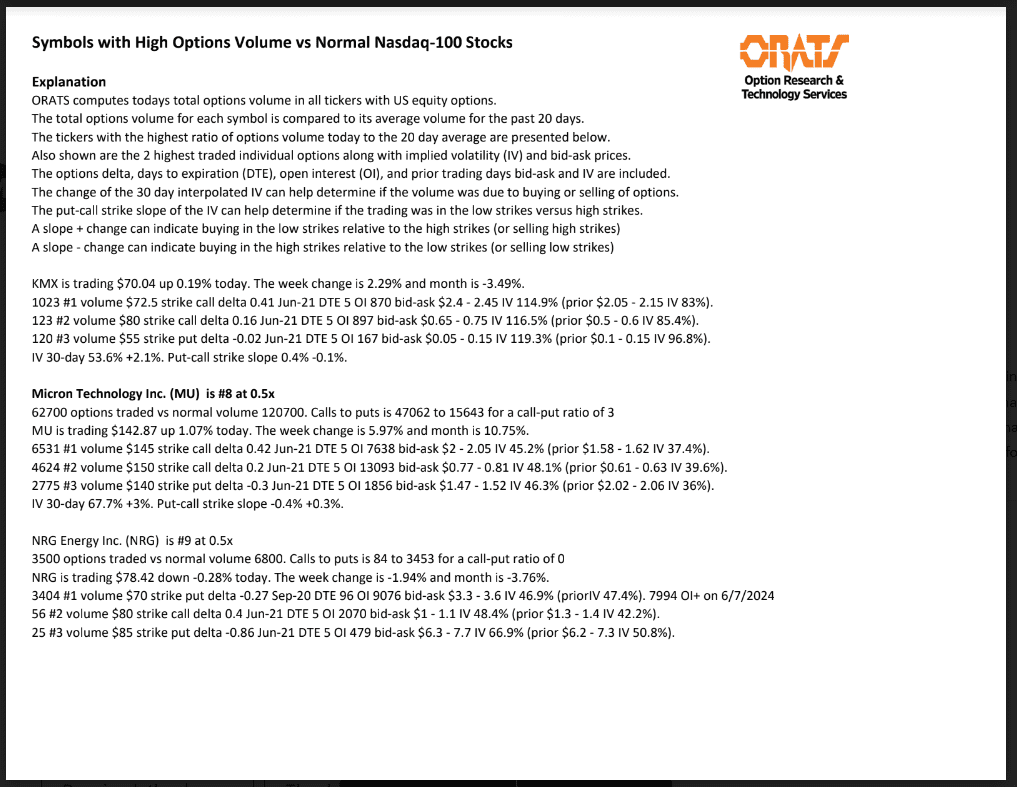 Information available on ORATS.com is available to all subscribers. ORATS does not make recommendations as to particular securities or derivative instruments, and does not advocate the purchase or sale of any security or investment by you or any other individual. ORATS does not guarantee the accuracy, completeness or timeliness of the Information. By using the Services of ORATS.com, including any applications or content available through us, you agree that use of the Services is entirely at your own risk. You understand and acknowledge that there is a very high degree of risk involved in trading options and securities. Past results are not indicative of future returns that may be realized by you. We assume no responsibility or liability for your trading and investment results.