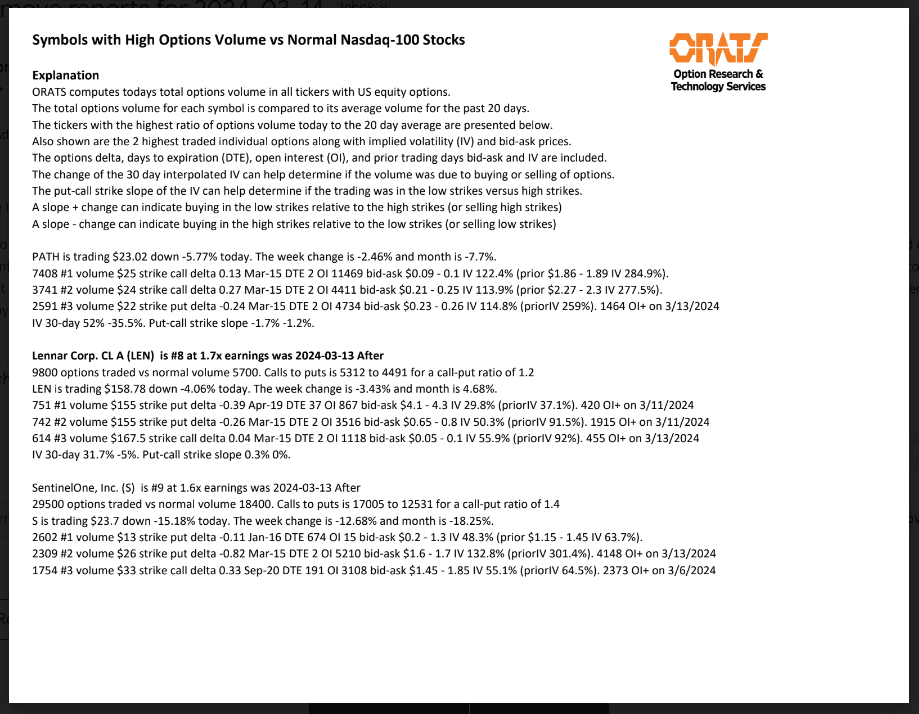 DKS, PZZA, BALL, HAS, AVTR, IBB, PATH, LEN, S, and DG have unusual options volume today.
