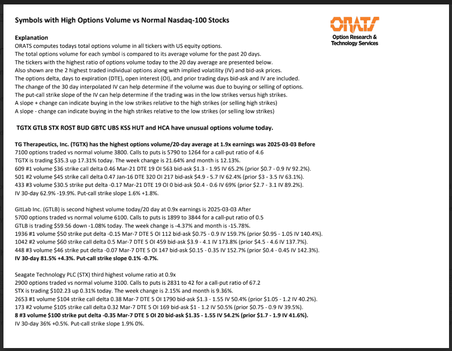 TGTX, GTLB, STX, ROST, BUD, GBTC, UBS, KSS, HUT, and HCA have unusual options volume today.