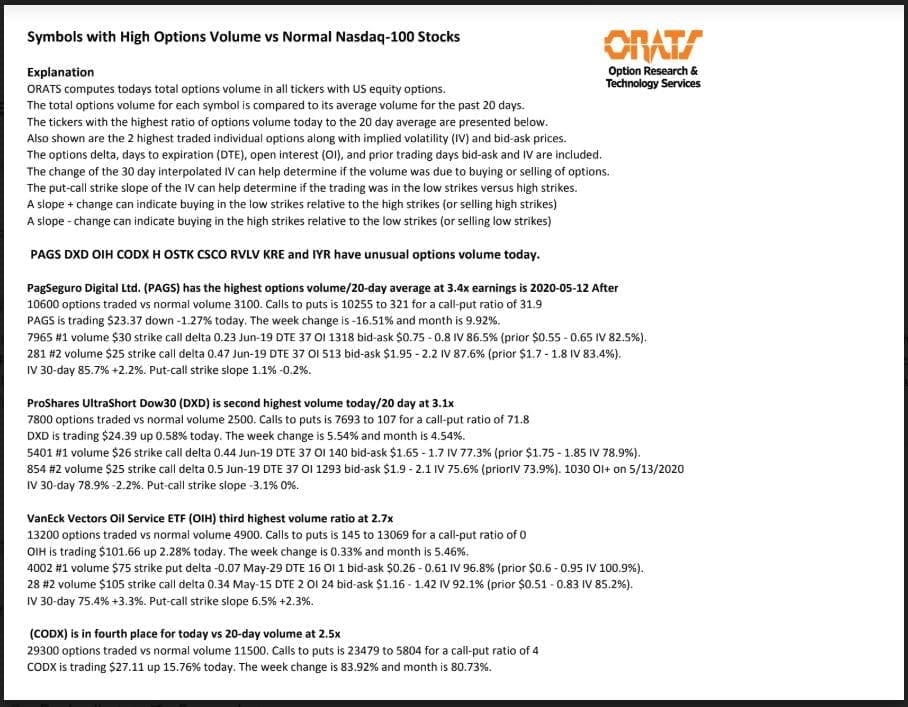 PAGS, DXD, OIH, CODX, H, OSTK, CSCO, RVLV, KRE and IYR have unusual options volume today.