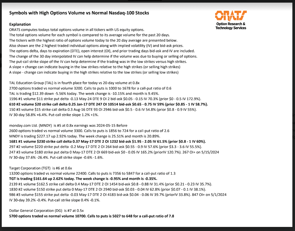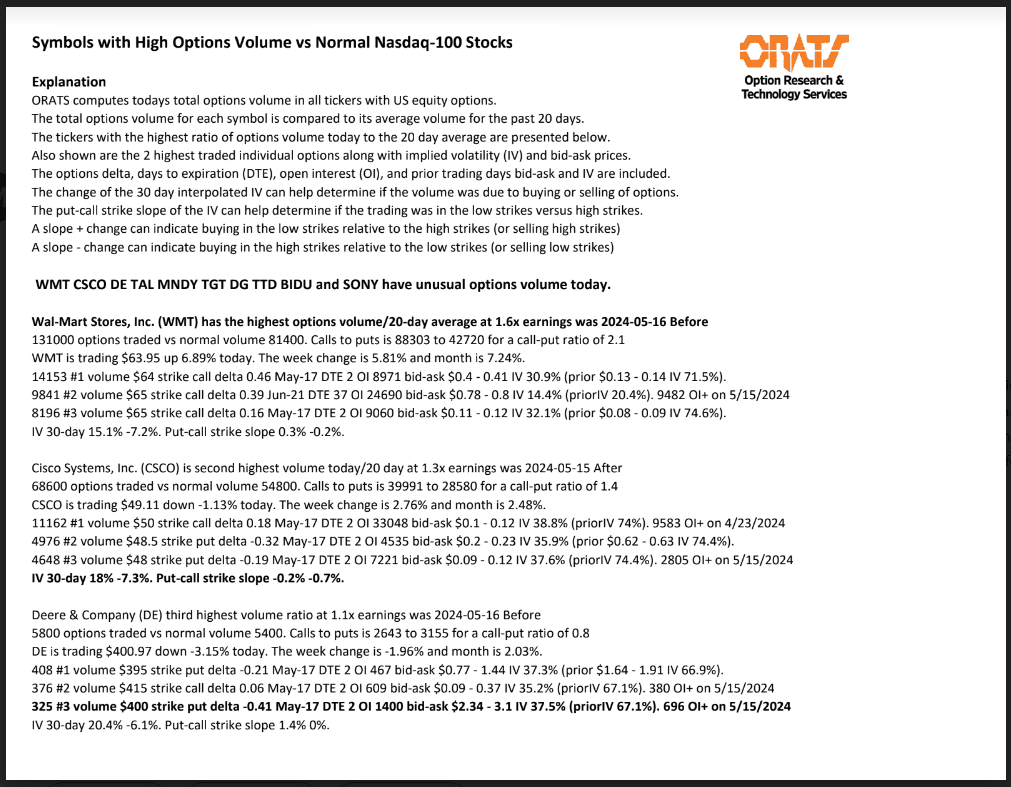 WMT, CSCO, DE, TAL, MNDY, TGT, DG, TTD, BIDU, and SONY have unusual options volume today.