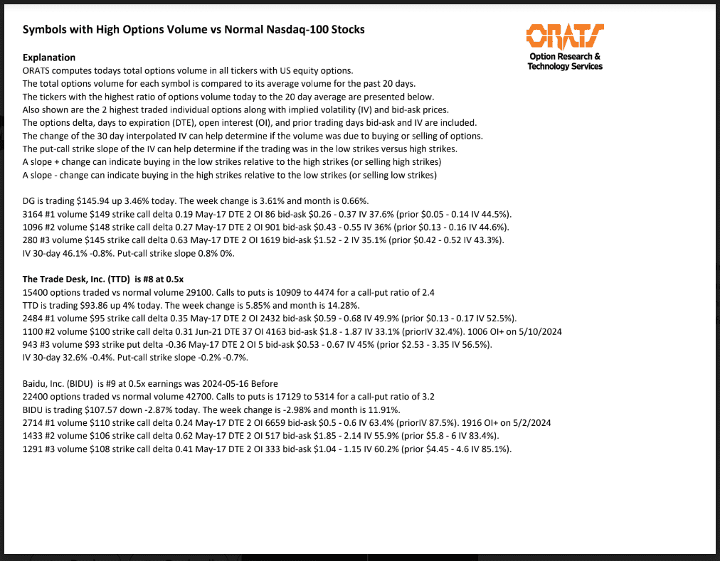 Information available on ORATS.com is available to all subscribers. ORATS does not make recommendations as to particular securities or derivative instruments, and does not advocate the purchase or sale of any security or investment by you or any other individual. ORATS does not guarantee the accuracy, completeness or timeliness of the Information. By using the Services of ORATS.com, including any applications or content available through us, you agree that use of the Services is entirely at your own risk. You understand and acknowledge that there is a very high degree of risk involved in trading options and securities. Past results are not indicative of future returns that may be realized by you. We assume no responsibility or liability for your trading and investment results.